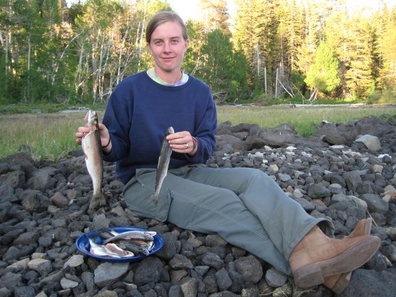 The fish photo is from the Thousand Lakes Wilderness trip. We caught more than we could eat in just three hours; fishing in the middle of the day!A note from Mike:All together Jensine has had the pleasure of experiencing the Trinity Alps, Marble Mountain, and Thousand Lakes Wildernesses.Her smile brightens the forests.
